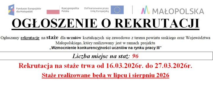 UWAGA! PRZED ZŁOŻENIEM DOKUMENTACJI ZAPOZNAĆ SIĘ Z REGULAMINEM UDZIAŁU W STAŻACH. Poniżej dokumenty do pobrania (PDF) Skrócony regulamin rekrutacji na staże 2026 – najważniejsze informacje >>KLIKNIJ W trakcie procesu rekrutacji uczeń składa Formularz zgłoszeniowy...